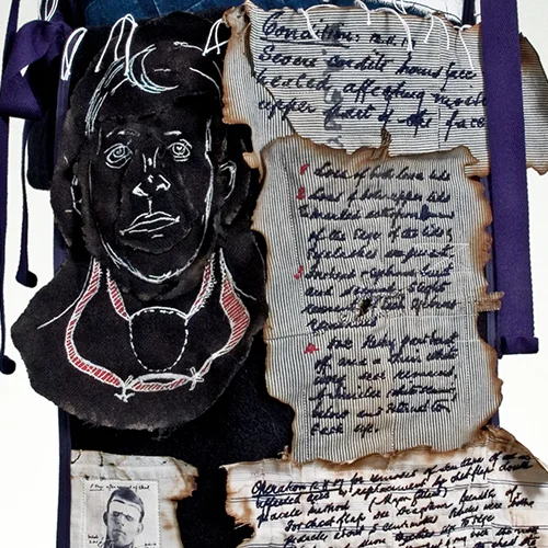 In 2004, the collaborative team of Paddy Hartley, Dr Andrew Bamji and Dr Ian Thompson were awarded a Wellcome Trust SciArt Production Award to enable Hartley to research and interpret the untold stories held at the Gillies Archives. His goal was to make interactive work which would translate the medical records of a selection of Gillies patients, and to conduct research into their pre and postoperative lives. While the medical records comprehensively describe the multiple surgeries the servicemen underwent, very little is known about the servicemen themselves and how they went on to live the rest of their lives after receiving such horrific injuries and groundbreaking surgery. Vintage uniforms similar to those worn by the men when sustaining their injuries were treated as a canvas on which to tell individual stories. Embroidery became a means of combining and communicating archival material with newly discovered information about the men and how they dealt with their life changing injuries and surgeries. The fabric and stitch of the uniforms related directly to the skin, tissue and stitch with which Gillies worked. Hartley was able to trace a number of descendants of the men whose stories he aimed to interpret. Their generous contributions of memories were a valuable addition to research conducted at the National Archives, Kew as to the pre and post war lives of the men, some of which were heart-warming and life affirming, others were brutally tragic.